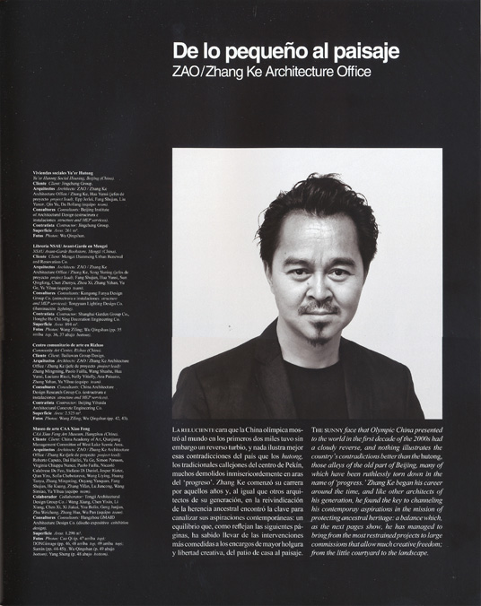 THE SUNNY face that Olympic China presented to the world in the first decade of the 2000s had a cloudy reverse, and nothing illustrates the country's contradictions better than the hutong, those alleys of the old part of Beijing, many of which have been ruthlessly torn down in the name of 'progress.'Zhang Ke began his career around the time, and like other architects of his generation, he found the key to channeling his contemporay aspirations in the mission of protecting ancestral heritage: a balance which, as the next pages show,he has managed to bring from the most restrained projects to large commissions that allow muchcreative freedom, from the little courtyard to the landscape.